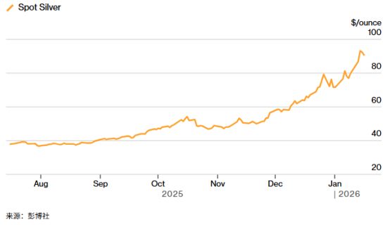 本周现货白银价格一度飙升至每盎司93美元以上的历史新高,较去年同期上涨了两倍多,有望连续第九个月上涨——是自1950年有记录以来最长的连涨纪录。